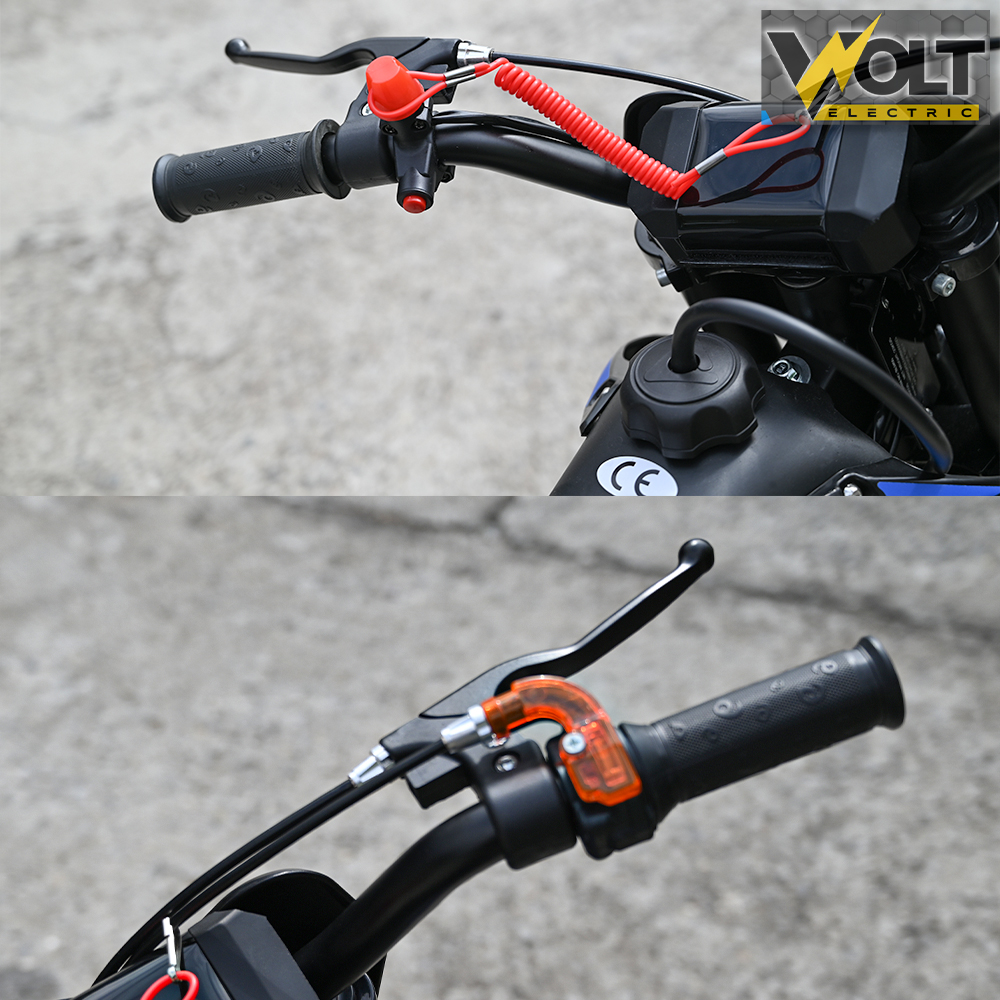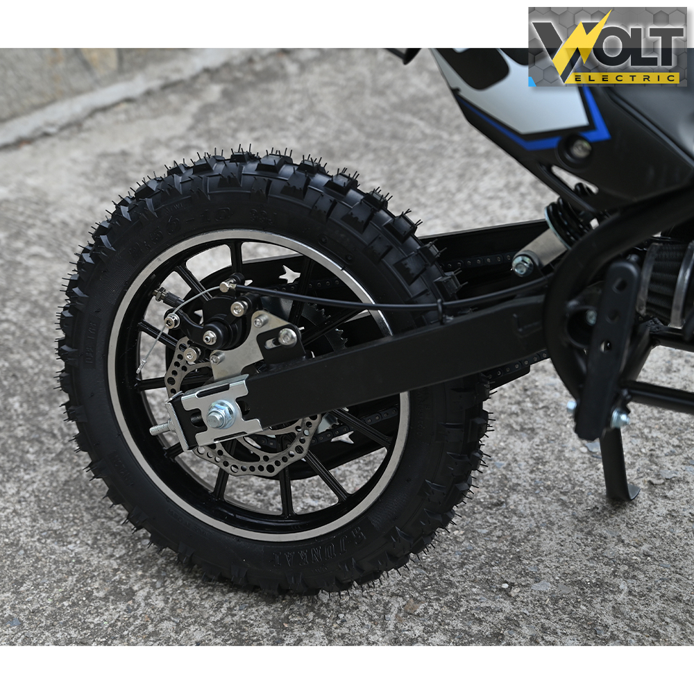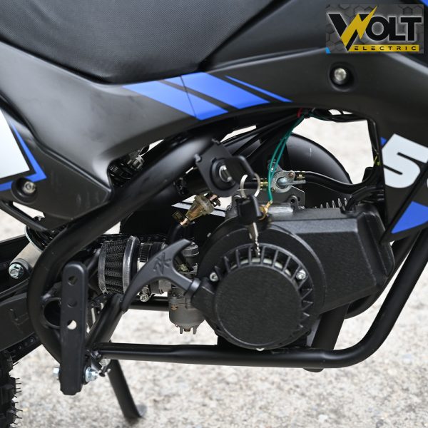 Детски бензинов кросов мотор, 50 кубика, подходящ за деца от 3 до 8 годишна възраст. Запалване с въже, с добавена функция „лесен старт“. Ограничител на палеца за подаване на газта. Двутактов бензинов двигател. Макс. скорост- 25 км/ч.