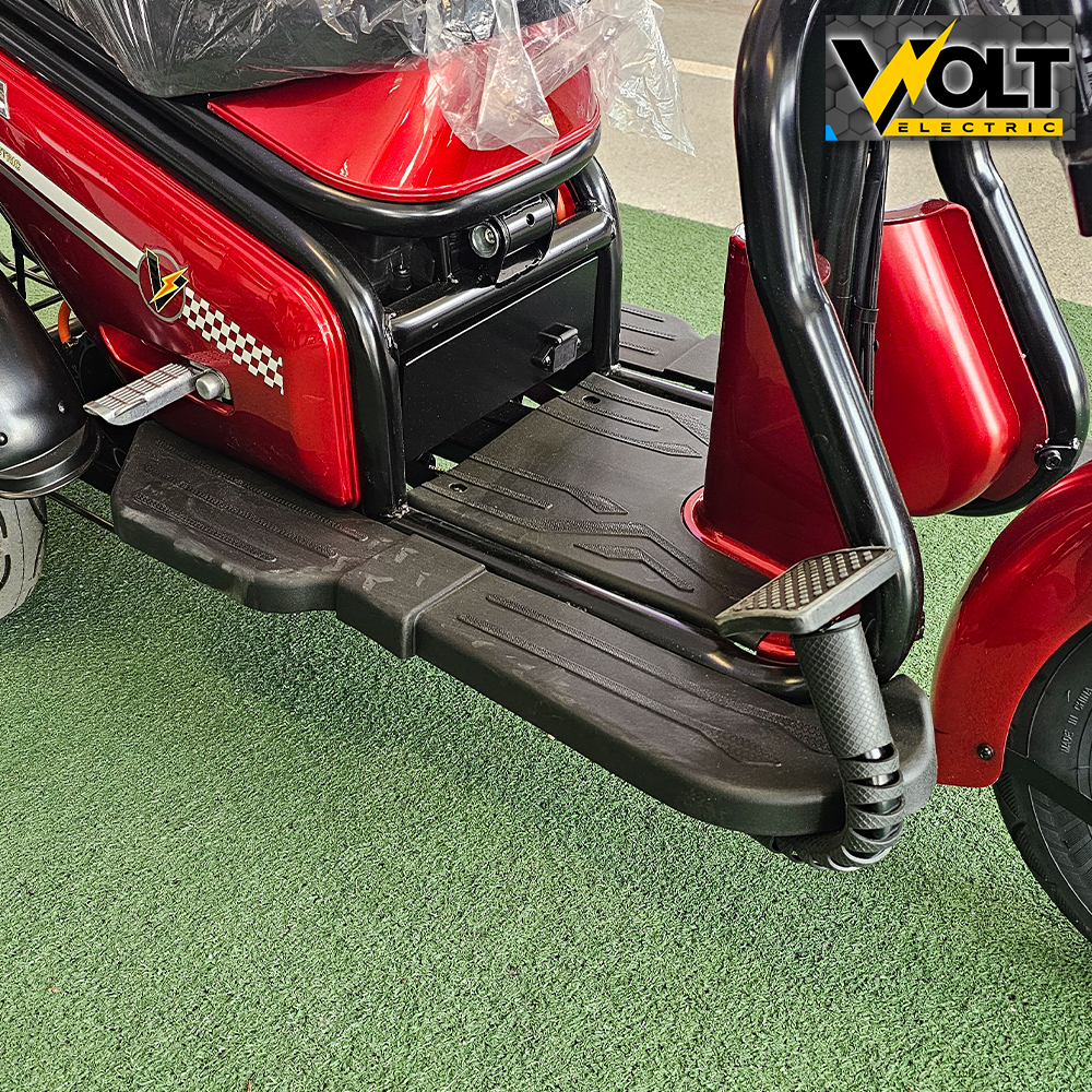 Двуместна електрическа триколка Volt Electric PUDDING PRO 1800W. Триколката е предвидена за един или двама пасажери, като за втория са предвидени изскачащи странични степенки. Задно предаване, голяма мощност, изкачва голeми наклони с товар без никакво усилие. 1200W номинална мощност на двигателя и 1800W максимална- повечето модели на пазара са с 600W реална мощност. Голям пробег от над 40 км, възможност за добавяне на 5-та батерия, за удължаване на пробега до над 60 км. Дистанционно управление, аларма, безконтактно палене. Увеличена максимална скорост в сравнение със стария модел от 25 на 35 км/час. Възможност за поставяне на покривна конструкция със предно стъкло, чистачка и страници за употреба при дъжд или в студения сезон.