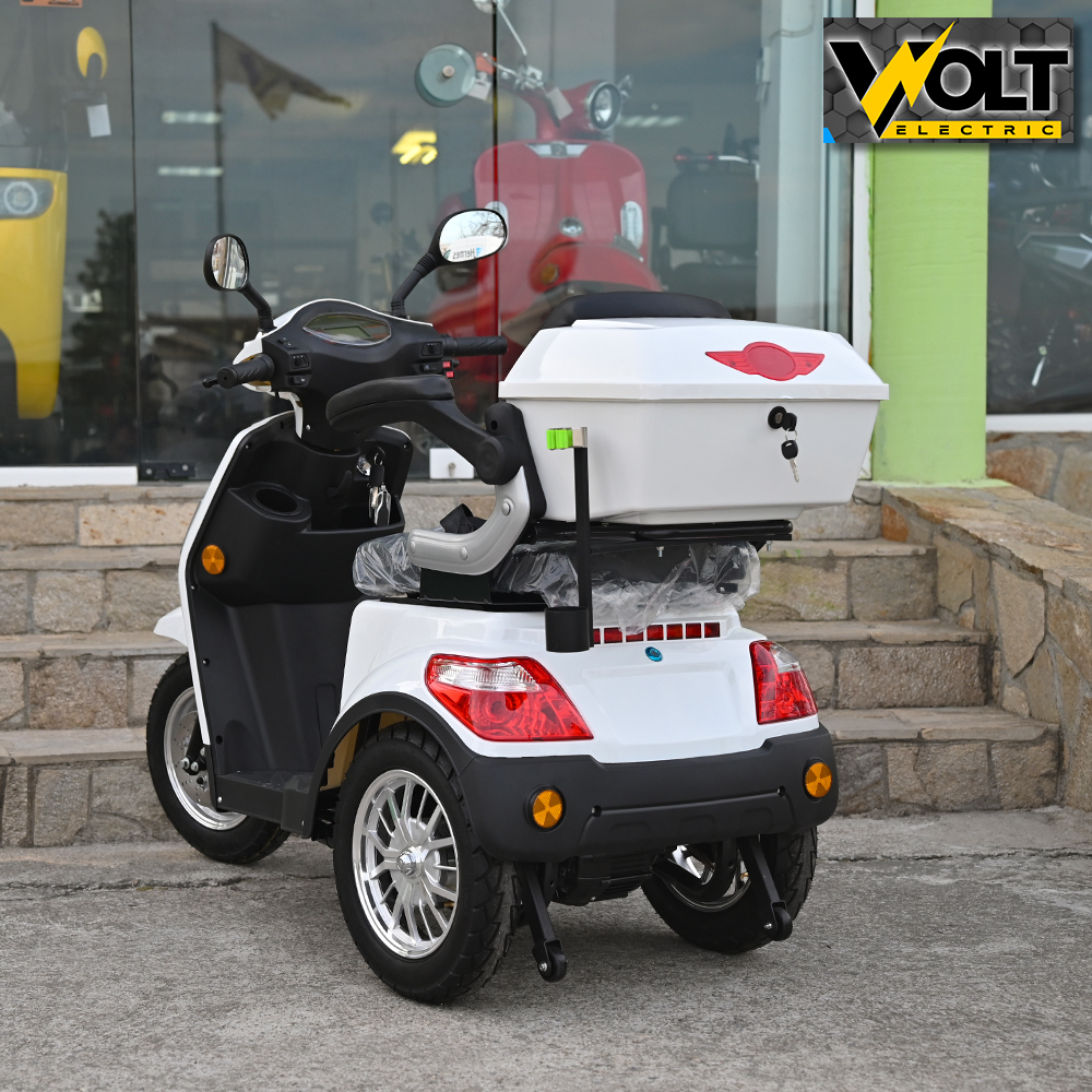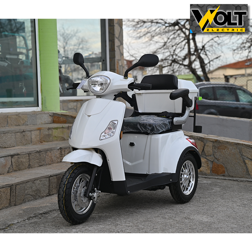 Eлектрическа триколка за възрастни и трудноподвижни лица VOLT Electric FM1 WHITE. Електрическата триколка е последен модел и е абсолютен хит. Тя се предлага с някои подобрения от предходния модел – в окачването, контролера, спирачките и най-важното тя е снабдена с три вида скорости – бавна, средна и бърза /с плавен старт/. Модела е снабден с висококачествена пластмаса и последен модел алуминиеви джанти. Без аналог на нашия пазар спрямо качество – цена. Триколката е снабдена с рекуперация и магнитна спирачка- при отпускане на газта или спускане по наклони зарежда батерията и осигурява спиране, без натискане на предна или задна спирачка.