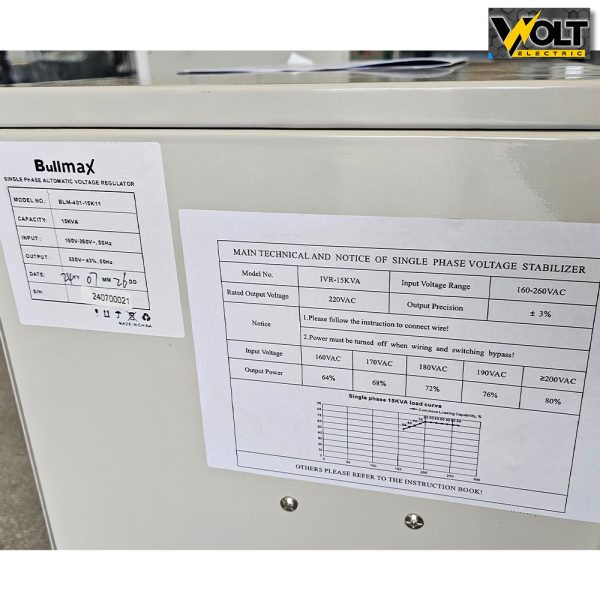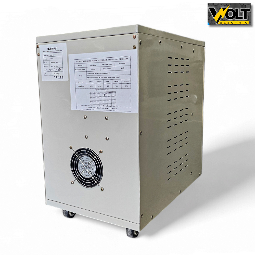 Стабилизаторът Bullmax 15KVA/12KW е изключително подходящ за защита на еднофазни системи и осигурява стабилност и дълготрайна работа на вашето оборудване. Идеален е за дома, офиса и малкия бизнес, като гарантира надеждност и безопасност на електрическите устройства.