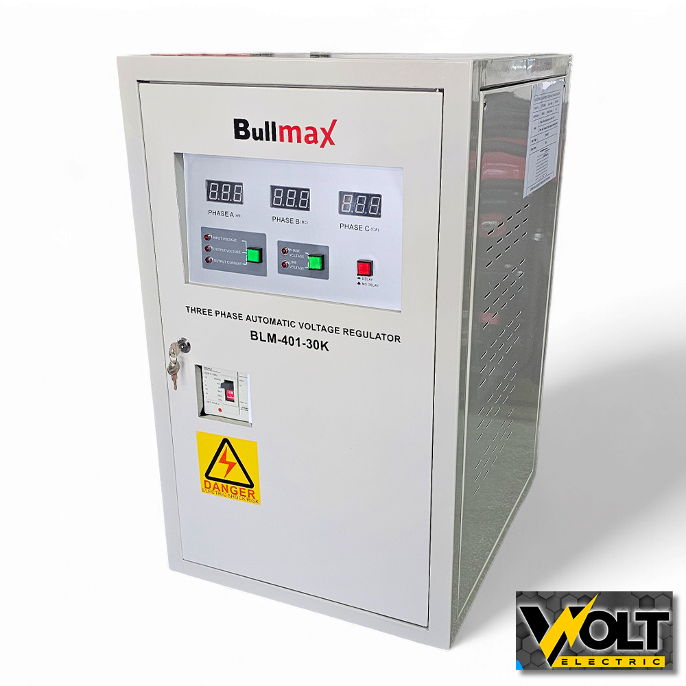 Представяме на вашето внимание новото поколение трифазни автоматични със серво мотор стабилизатори /регулатори/ за ток BULLMAX от ново поколение и мощност 30000 VA. Време за реакция 0 секунди /ZERO CROSS TRANSFER TECHNOLOGY/. Супер лесни за употреба, просто го включвате към мрежата и всичко се настройва автоматично, няма нужда от допълнителни настройки, както на стабилизаторите от по-старо поколение.